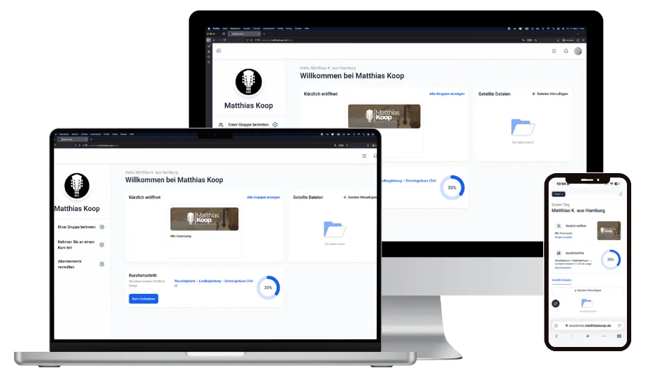 "Der Kurs macht richtig Spaß und ich habe mich von Anfang an gut aufgehoben gefühlt. Mein Ziel war es, Songs nachzuspielen und dazu zu singen – und genau das habe ich mit diesem Kurs endlich erreicht. Großes Lob an dich, Matthias! - Michi aus München