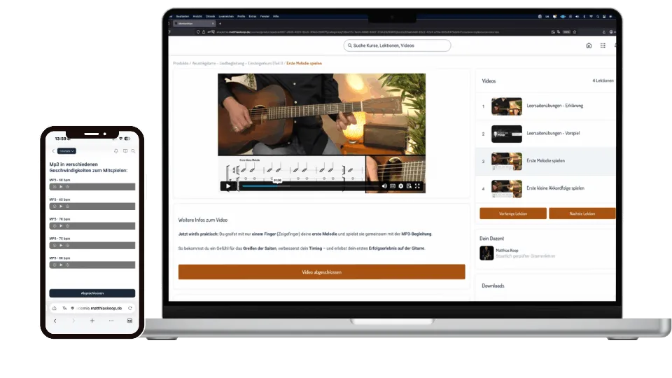 🎸 Über 3,5 Stunden Videomaterial & ca. 60 Videos: Schritt für Schritt aufgebaut – vom ersten Ton bis zu deinen ersten Songs.